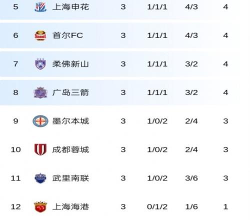 本场比赛结束之后,上海申花三战一胜一平一负,积4分位列第5,暂时处于晋级区内。而成都蓉城一胜两负积3分位列第10,海港一平两负积1分,中超卫冕冠军稳居亚冠倒数第一。