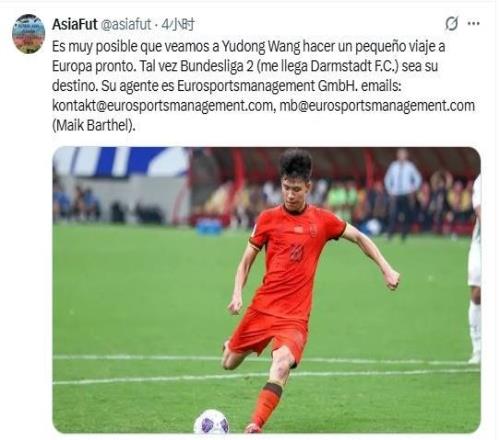 该博主写道:“王钰栋大概率将在不久后开启短暂的欧洲之行,德乙联赛(据消息指向达姆施塔特足球俱乐部)可能成为他的目的地。他的经纪公司是Euro sports management。